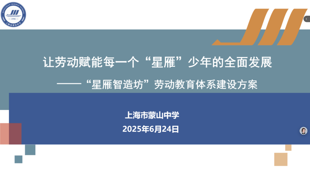 6月24日,华东师大专家团队与余下项目校(蒙山中学、教院附中、龙泉学校、金卫小学、朱行中学、松隐中学、松隐小学、张堰二中)在线上完成专题教研活动。项目校根据校情分析等内容汇报了本校的劳动教育体系建设行动方案,以及校本特色劳动教育教学案例。