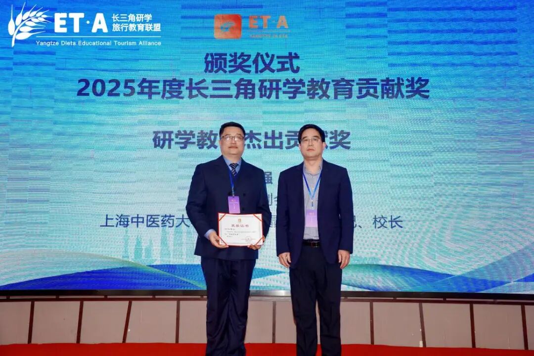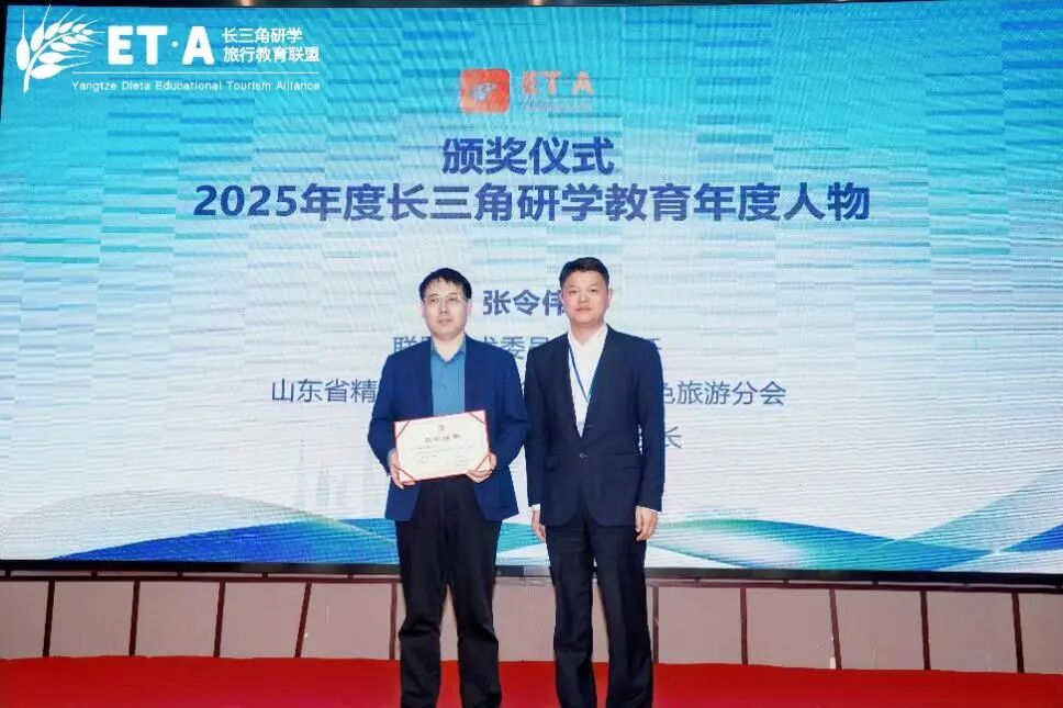 华东师范大学基础教育改革与发展研究所研学旅行教育研究中心主任杨光富为长三角研学教育“年度人物”获得者山东省精品旅游促进会研学和红色旅游分会执行会长张令伟颁奖。