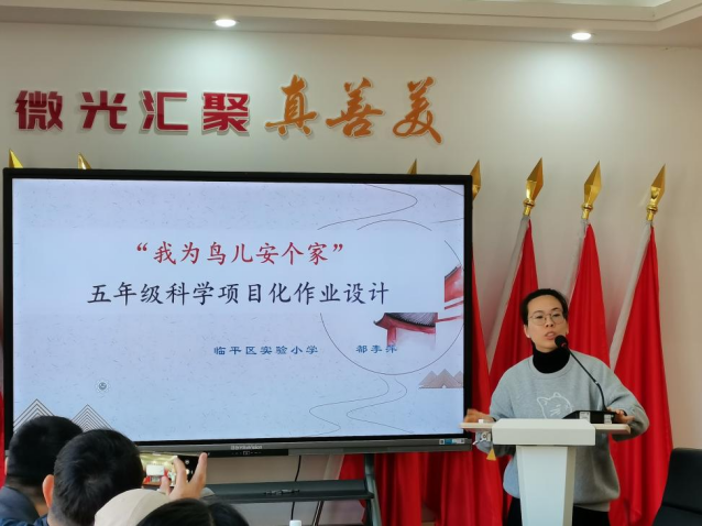 在学科教师汇报环节,科学教师都李萍汇报了将跨学科项目化案例转化为纯科学学科实践型作业的探索。她详细阐述了“寻找学科共通点、结合教材调整学段与内容、创设情境明确核心问题”的三步走路径,并将项目任务分解为“明确任务与知识奠基、自主设计与知识深化、设计制作与交流研讨”三个环环相扣的环节,构建了与课程标准严格对应的评价体系。