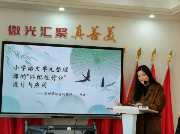 语文教师郑琰围绕“小学语文单元整理课匹配性作业的设计与应用”展开汇报。她提炼出“梳理性作业、运用性作业、衔接性作业、反思性作业”四种类型,并具体阐述了其应用步骤与要点,旨在引导学生构建结构化知识并解决真实问题。