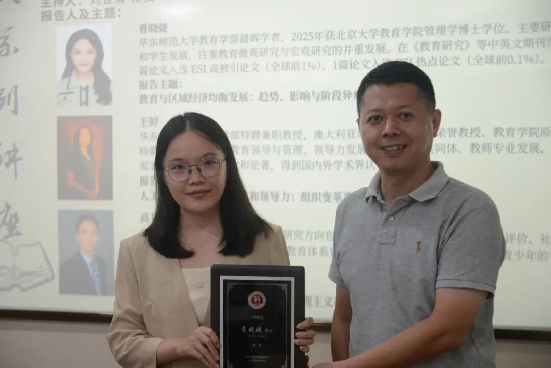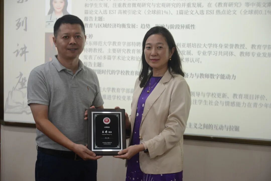 在报告会开始前,刘世清教授做开幕致辞。他向王婷教授、曹晓婕博士加入教育学系表示诚挚欢迎,向高星原副教授晋升表示衷心祝贺,希望教育学系全体师生积极适应时代要求,创新发展,为学校、学部教育学科建设贡献力量。随后,刘世清教授为三位老师颁发纪念牌并合影留念。