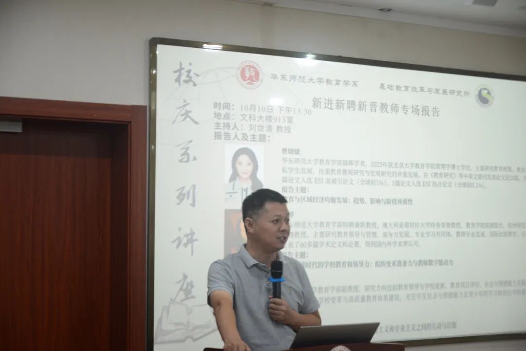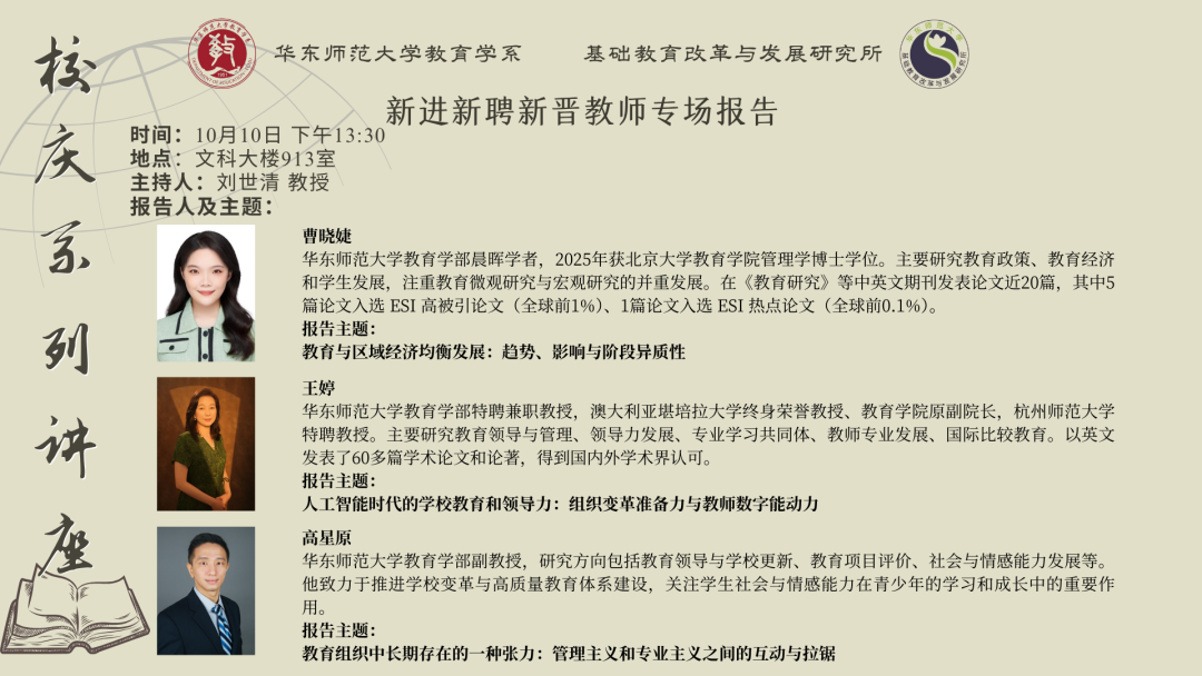 10月10日下午13:30,由华东师范大学教育学系、基础教育改革与发展研究所联合举办的校庆报告“新进新聘新晋教师专场”在普陀校区文科大楼913室举行。本次报告会的三位报告人分别是新进教师曹晓婕博士、高峰讲席教授王婷教授和新晋教师高星原副教授。教育学系教工党支部书记刘世清教授、李林教授担任报告会主持人。