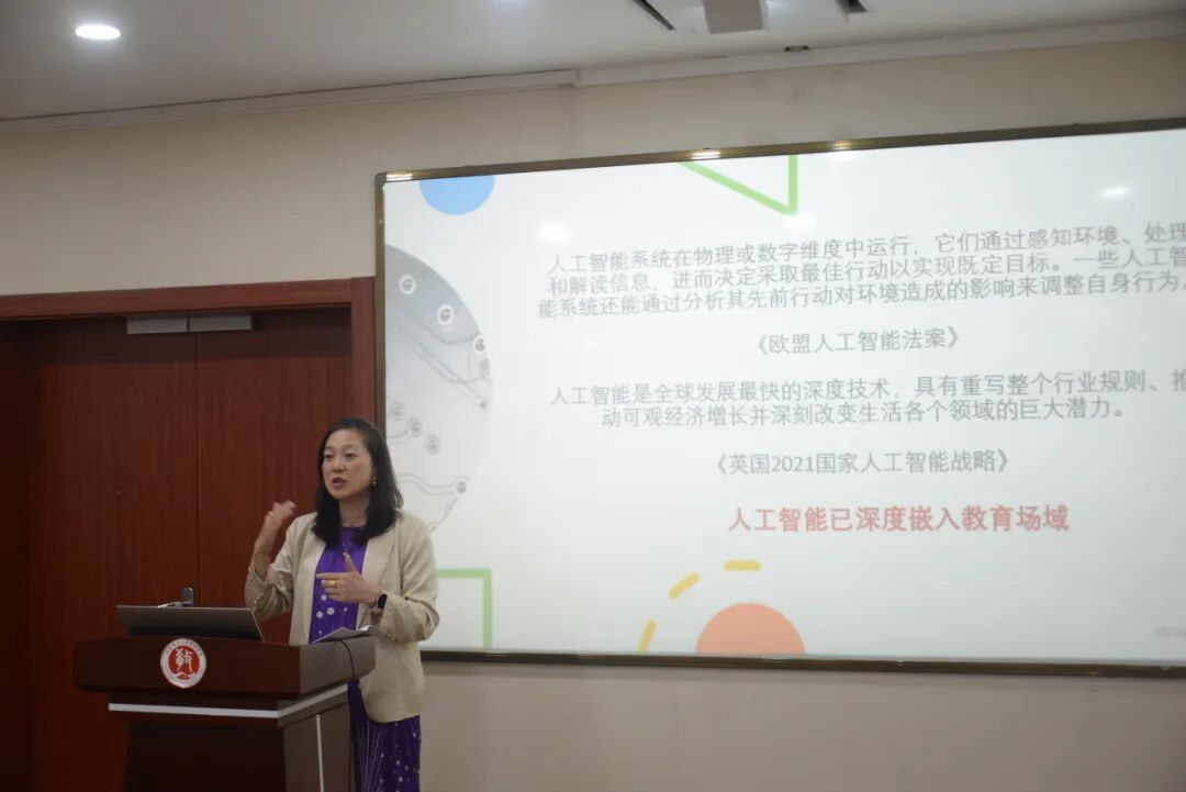接着,王婷教授分享了她的研究《人工智能时代的学校教育:组织变革准备力与教师数字能动力》。王老师从两个问题入手引出主题:一是,当人工智能全面进入学校时,我们如何判断现有教育系统是否具备系统准备力?二是,当算法和数据深入进入教学决策和治理时,我们如何守护教师与学生的能动性和人文价值?