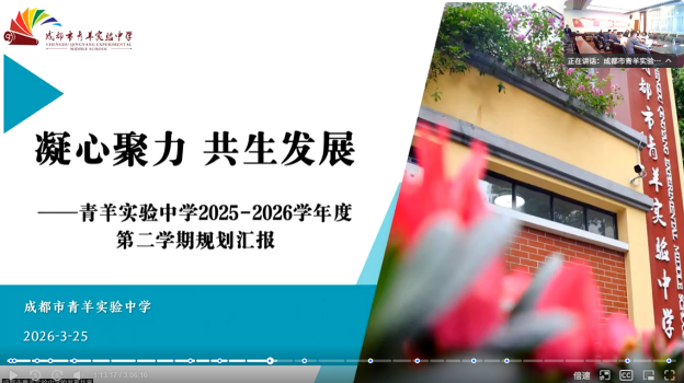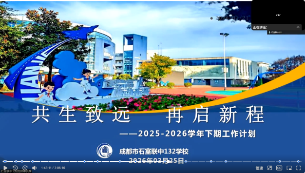 成都市石室联中132学校 以“共生致远 再启新程”为题,在回顾上学期成果基础上,聚焦“部门协同”“课堂常态”“育人载体”三大提升点。学校通过“双向反馈机制”“四色课堂评价量表”等创新实践,以“爱”凝聚共识,以“看见”激发动能,努力实现从“四有课堂”到“四色课堂”的品质跃升。